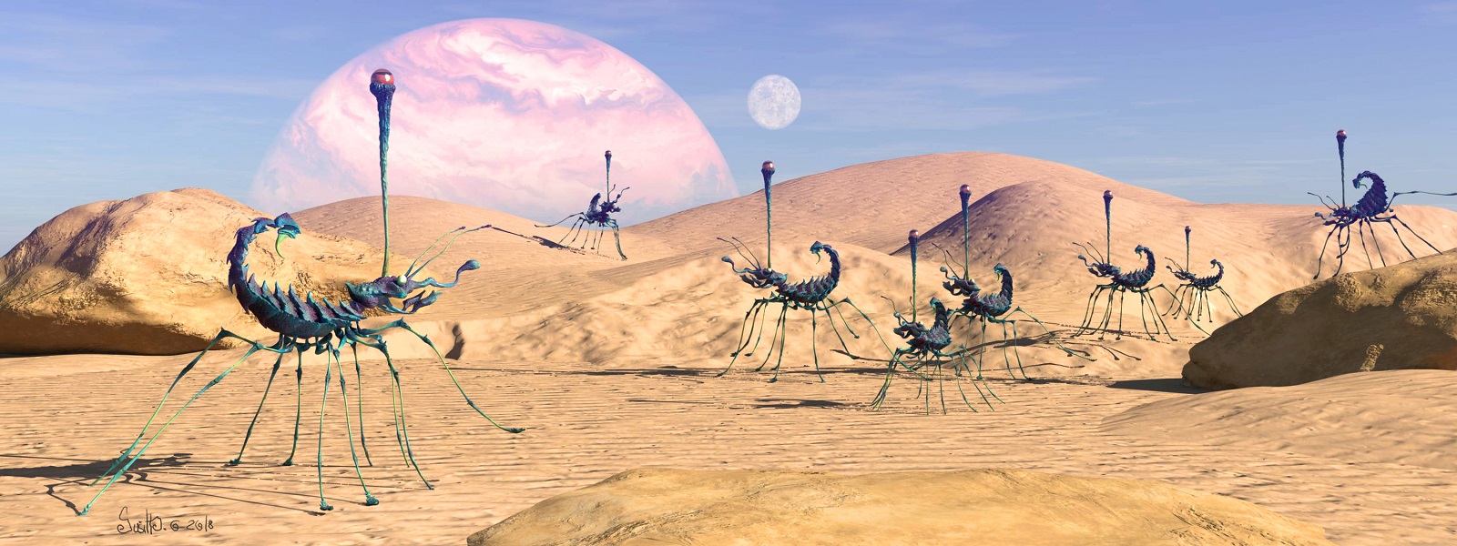 Eine der lieblichsten Landschaften Ari Moons bilden die Blue Mountains. Durch das außergewöhnlich milde Klima wird dieser Archipel auch Frühlingsland genannt. Der große Libellensegler ist einer der größeren Pflanzenfresser, die ausschließlich hier beheimatet sind.
